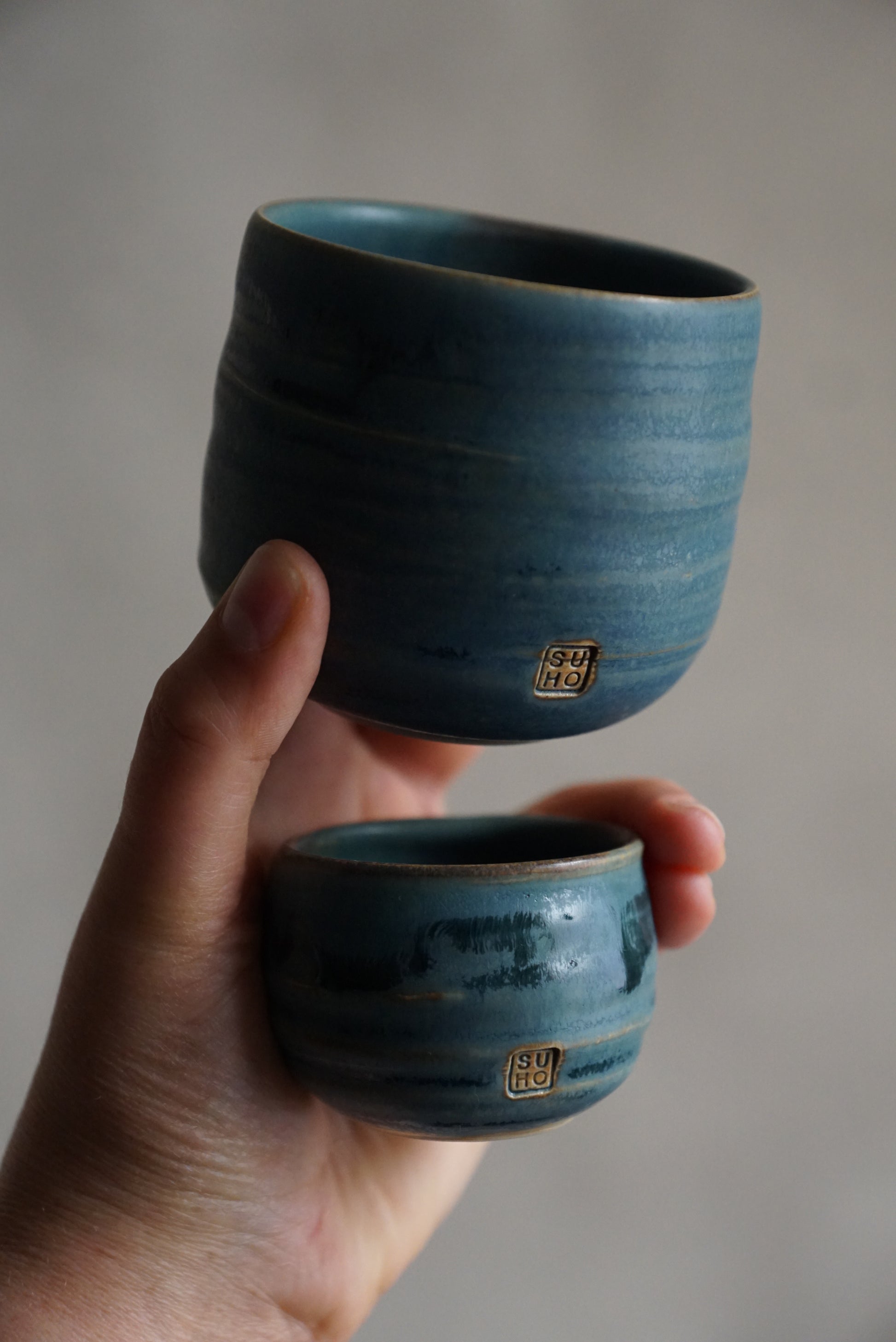 2er Set aus hellem Steinzeugton, von Hand gedreht, petrolfarben glasiert, gebrannt bei 1230°C.
