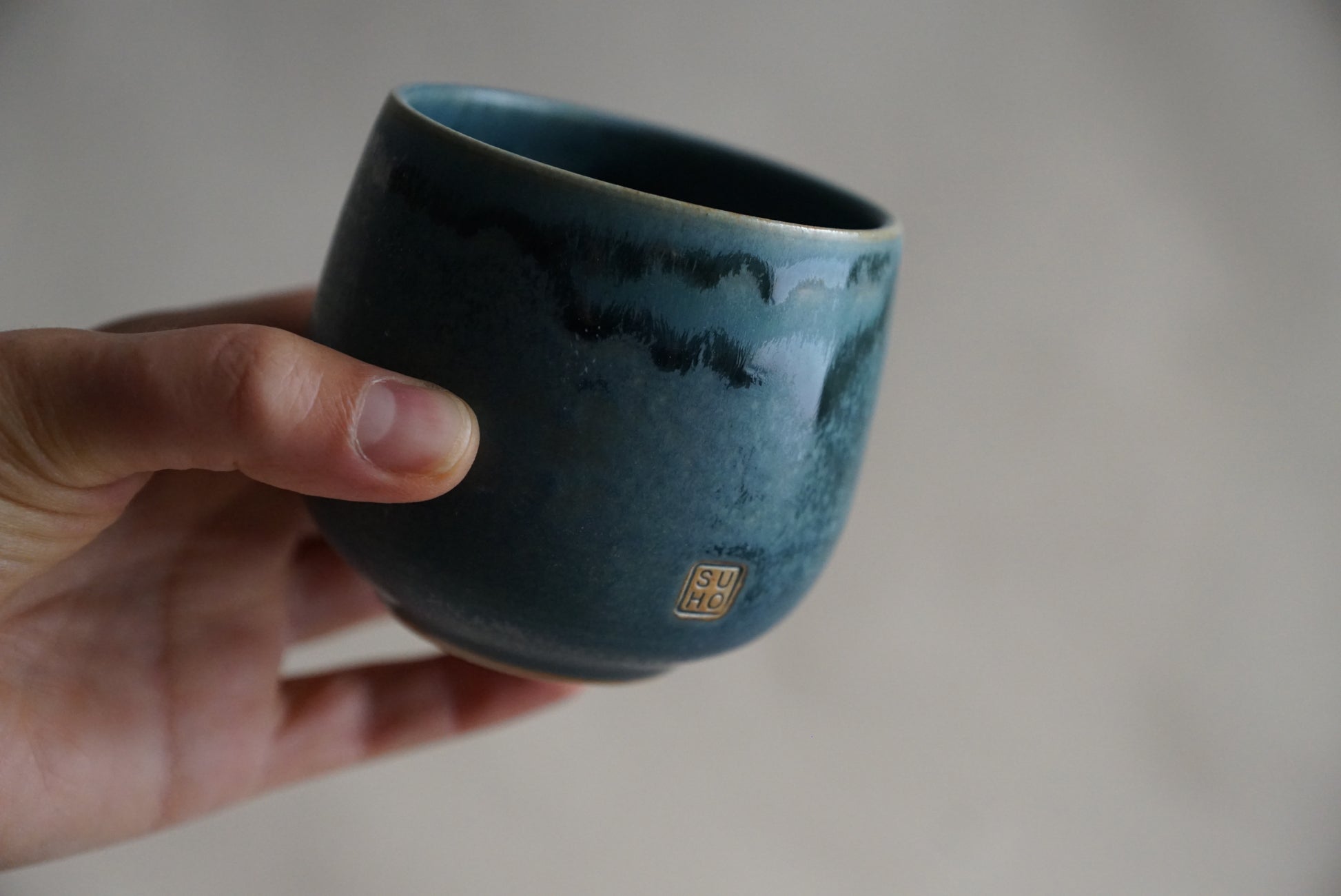 Unikat aus hellem Steinzeugton, von Hand gedreht, petrolfarben glasiert, gebrannt bei 1230°C.