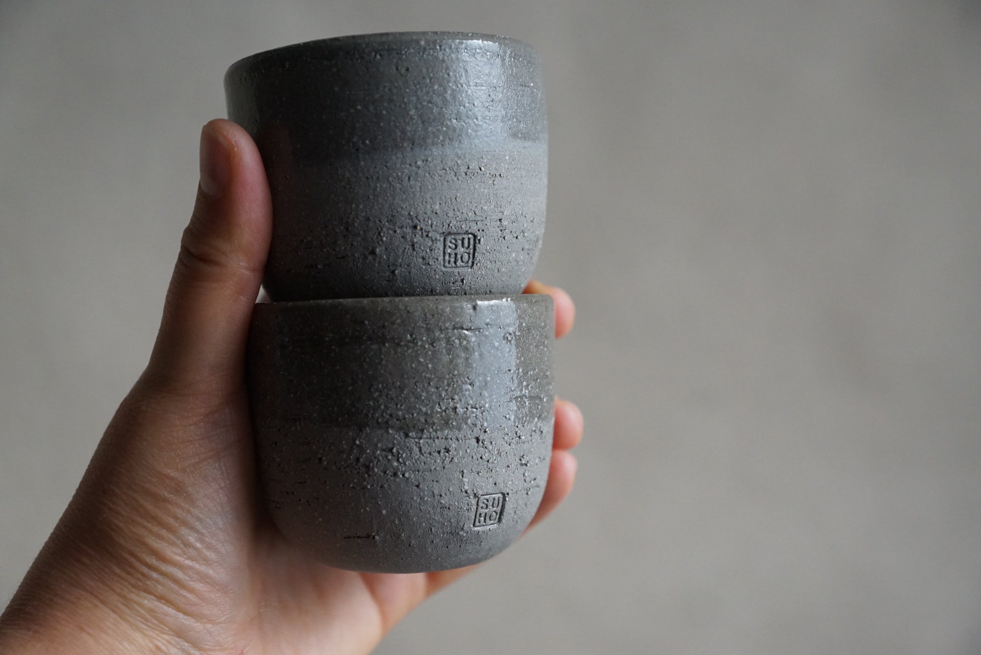 2er Sets aus anthrazit farbenem, schamottiertem Steinzeugton, von Hand gedreht, transparent glasiert, gebrannt bei 1230°C.