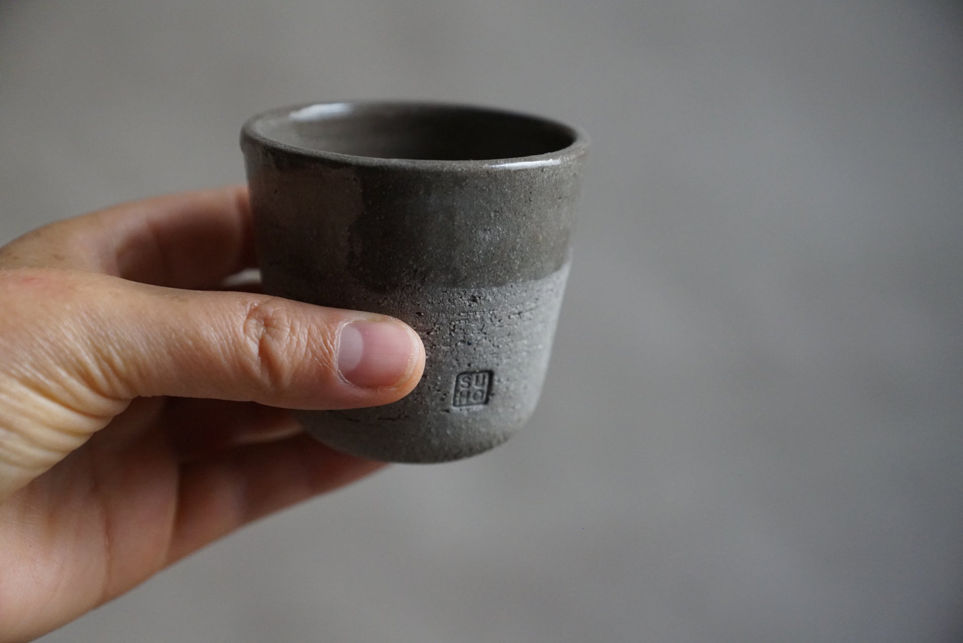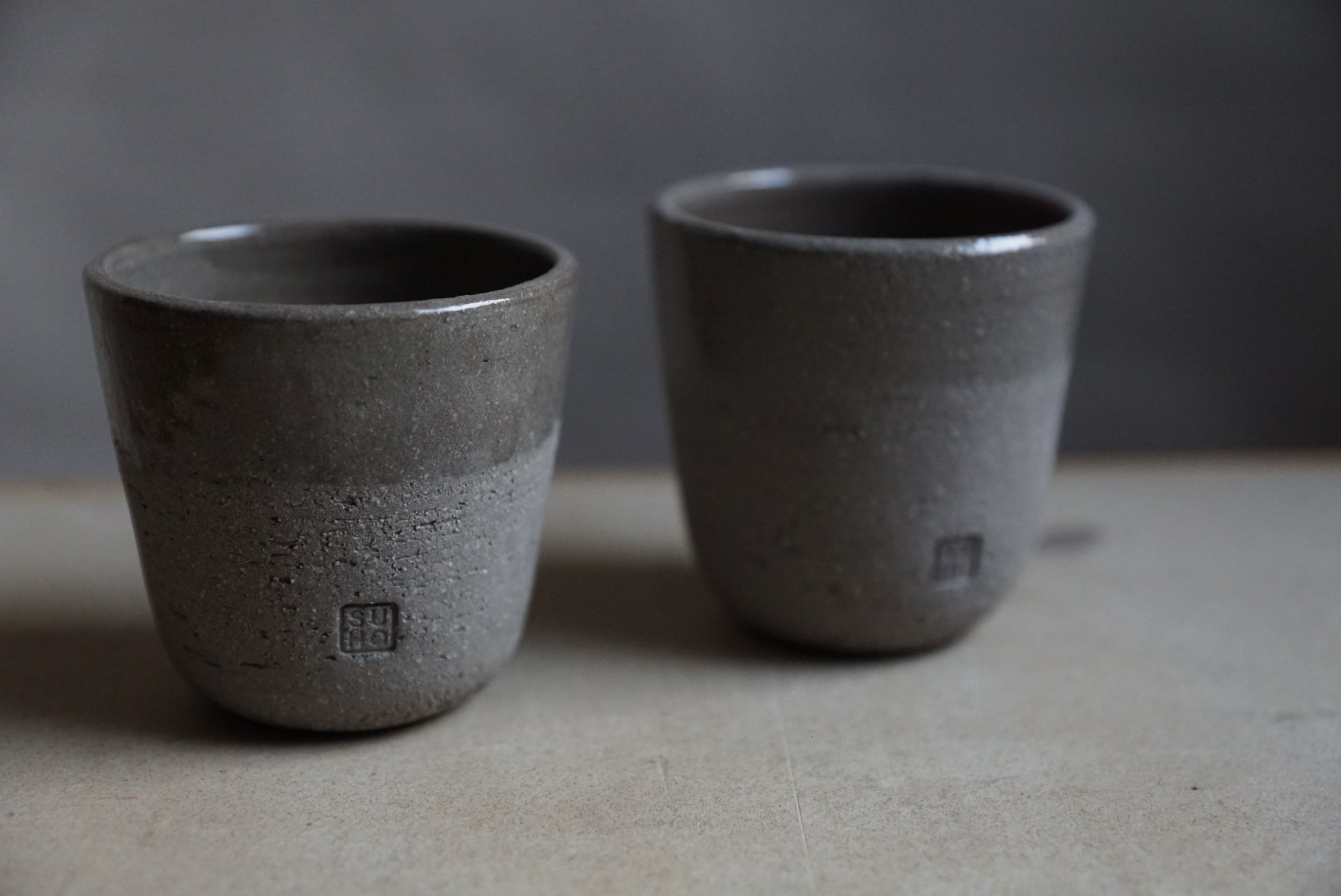 2er Sets aus anthrazit farbenem, schamottiertem Steinzeugton, von Hand gedreht, transparent glasiert, gebrannt bei 1230°C.