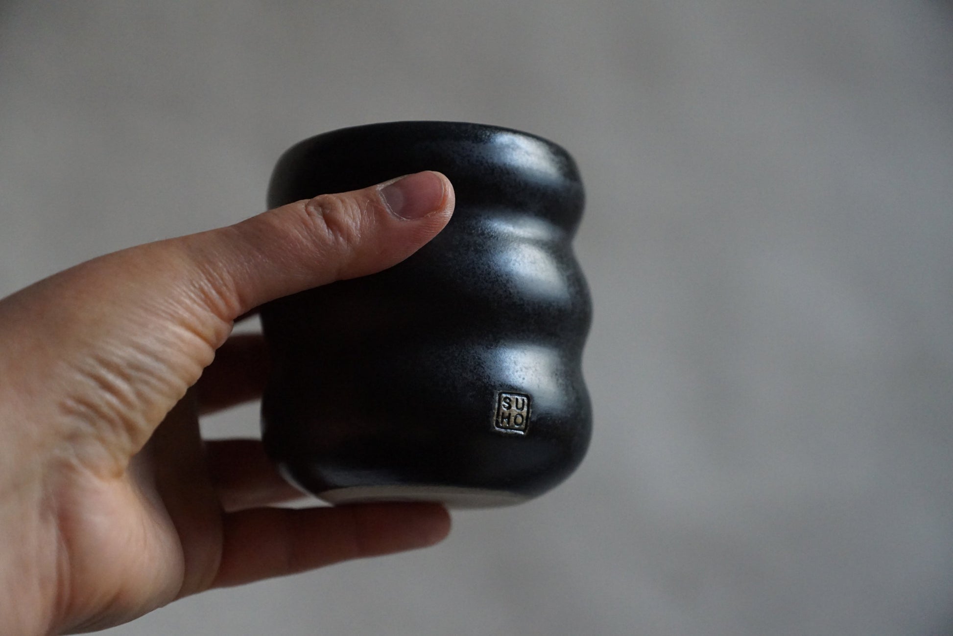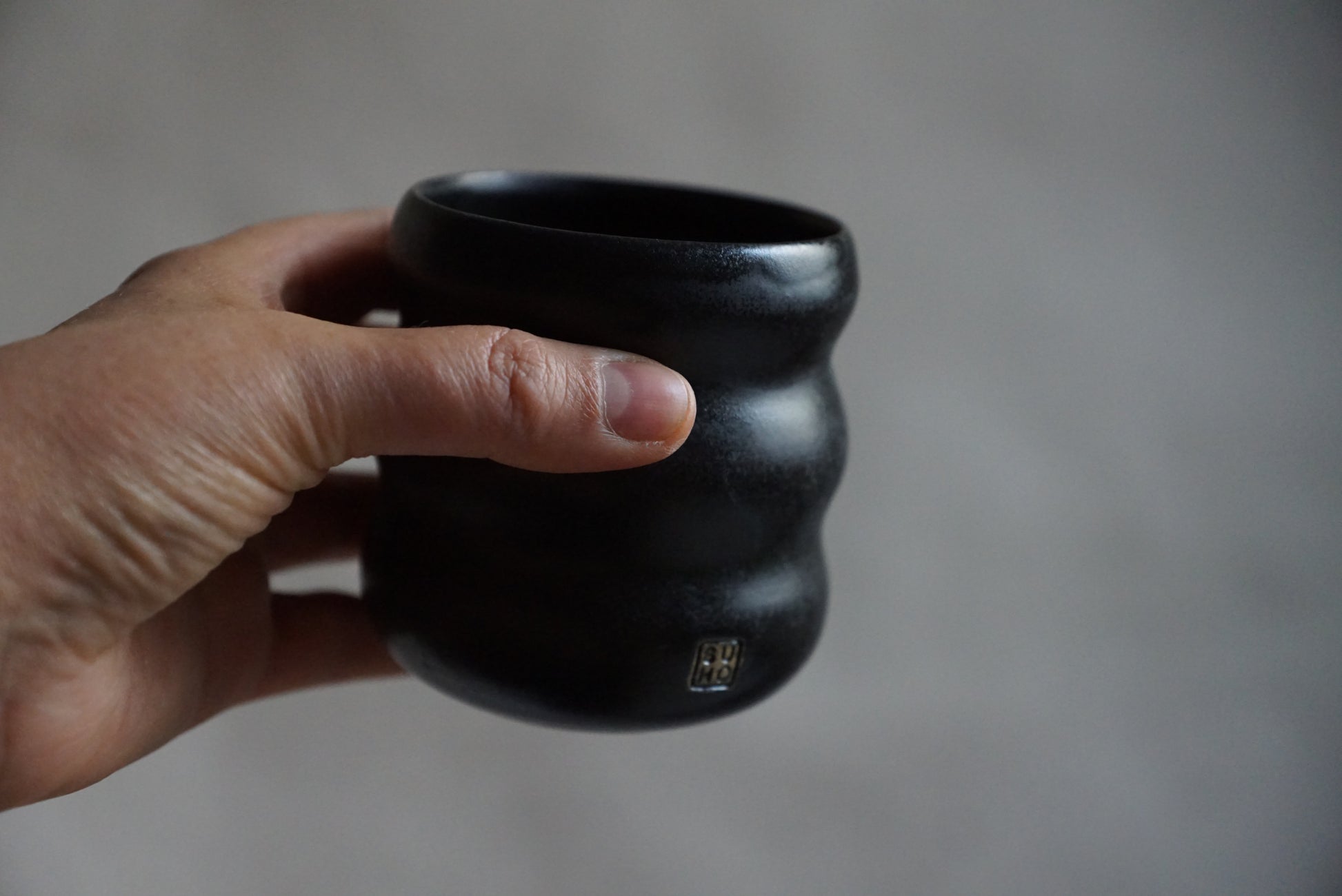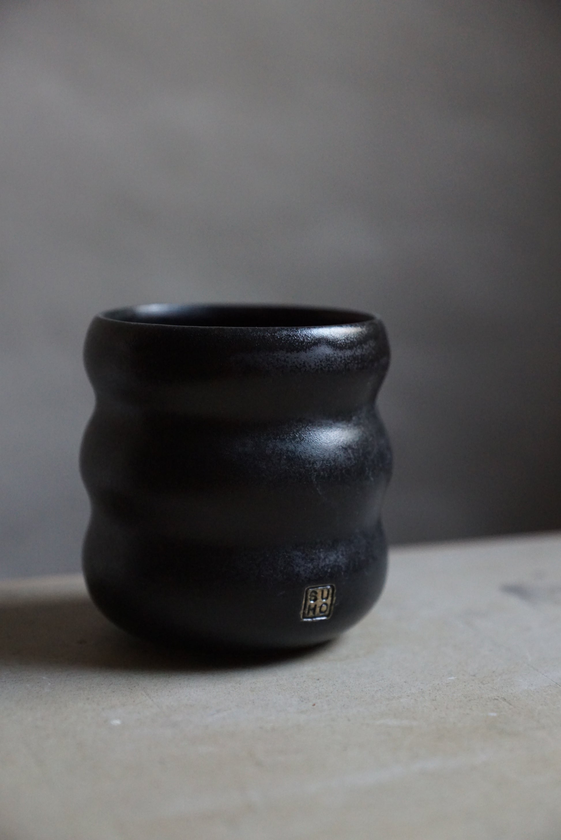 Von Hand gedrehter Becher aus hellem Steinzeugton, schwarz matt glasiert.