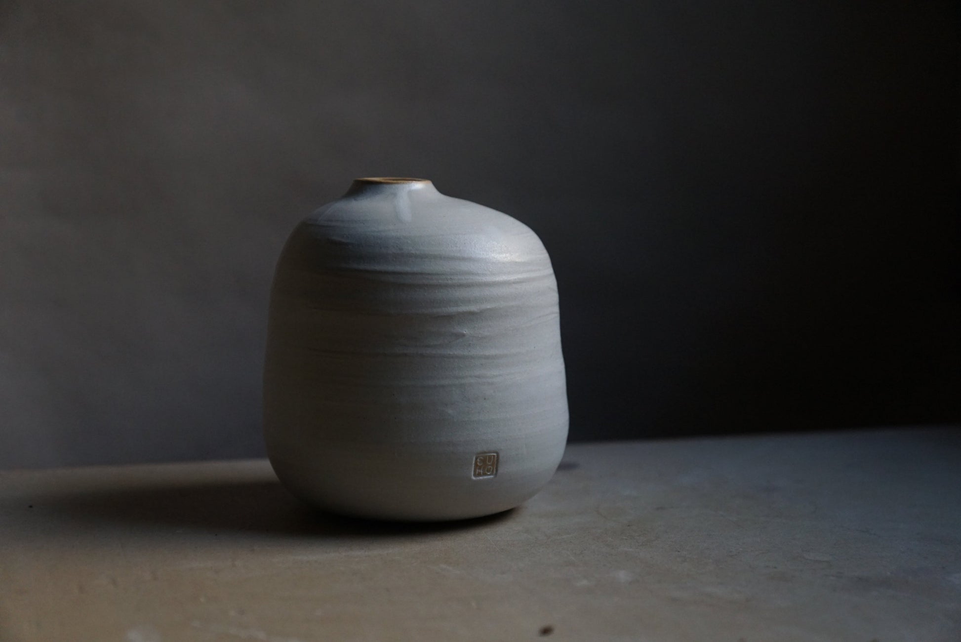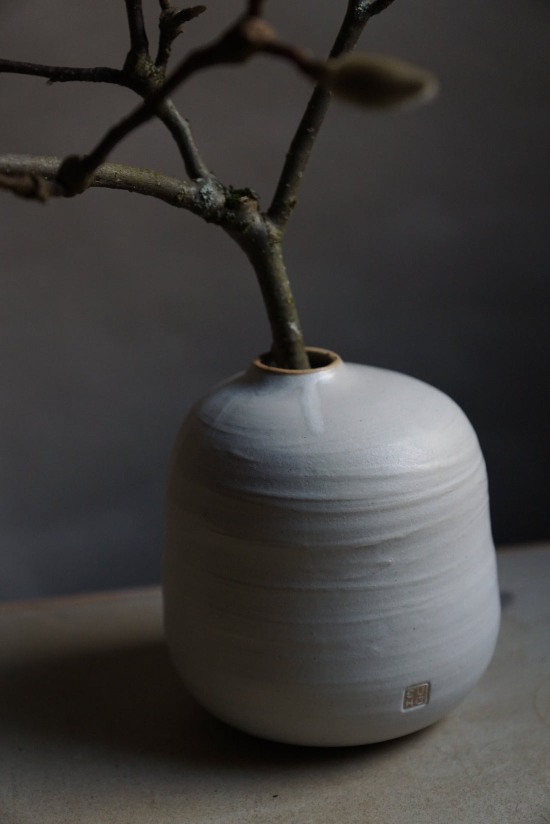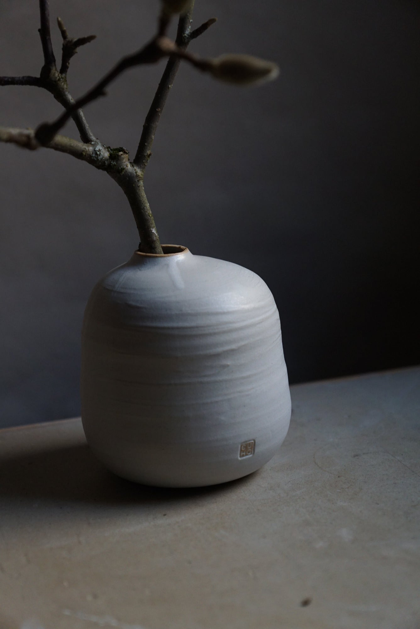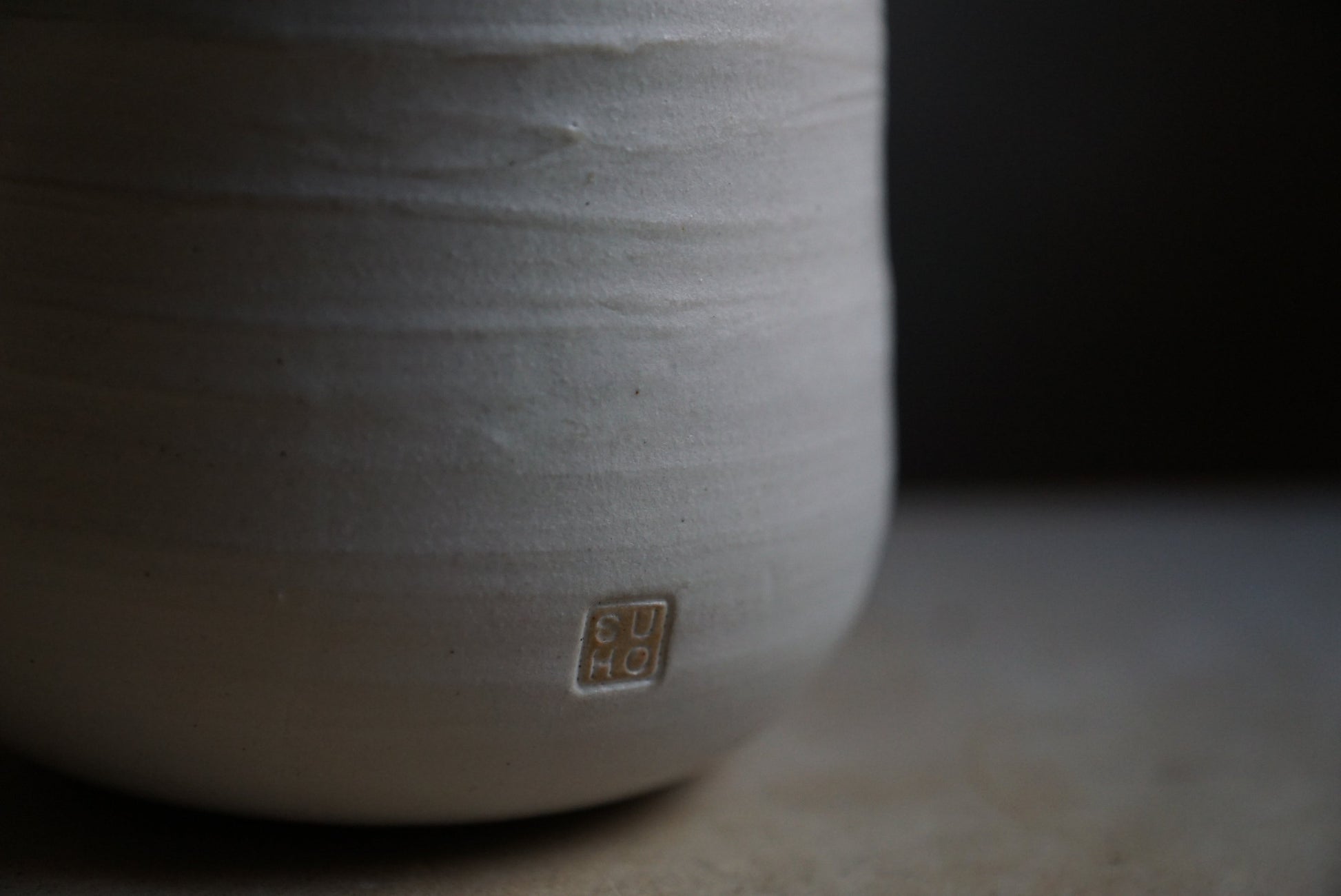 Einzelstück von Hand gedreht - aus hellem, groben Steinzeugton, matt weiß glasiert.