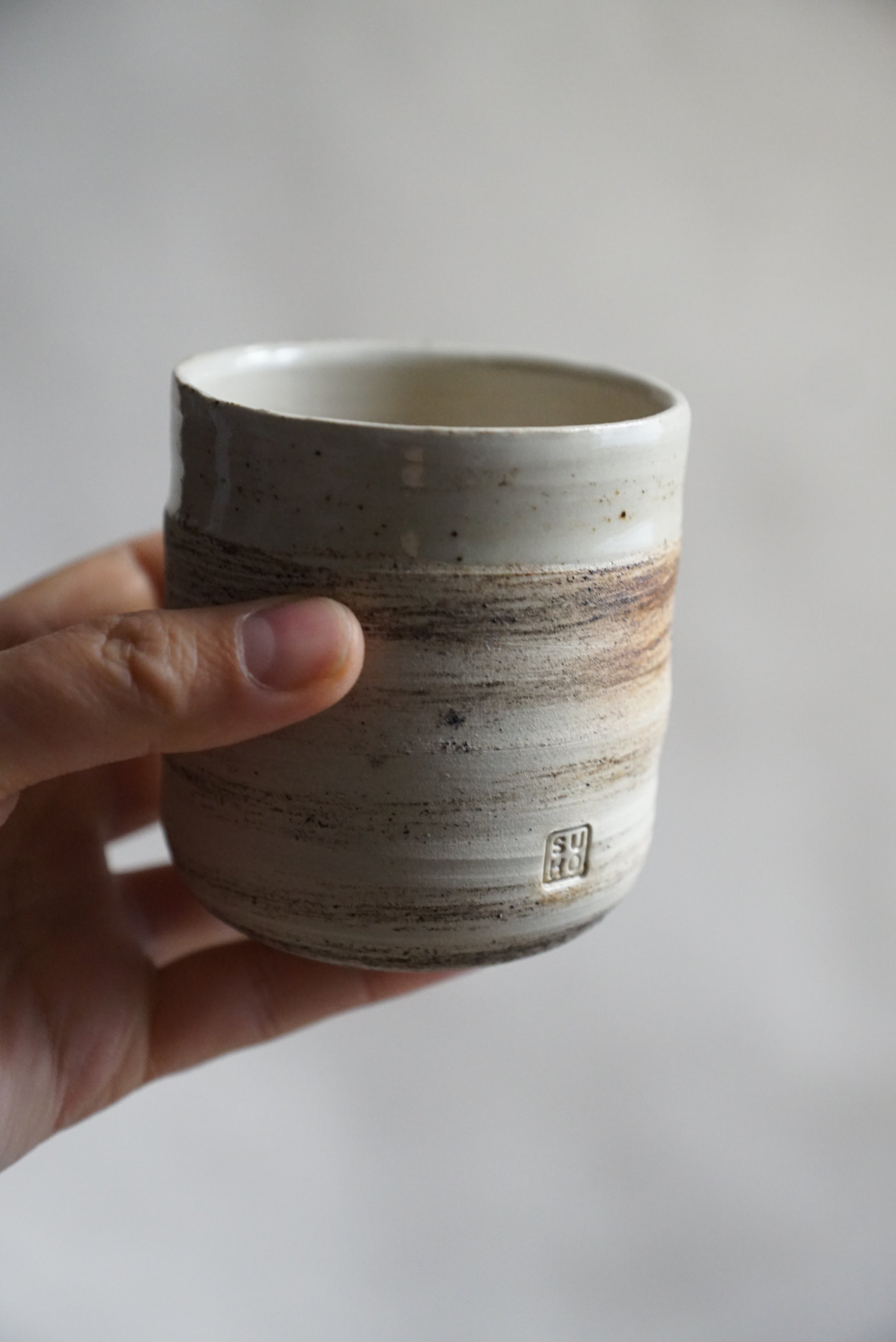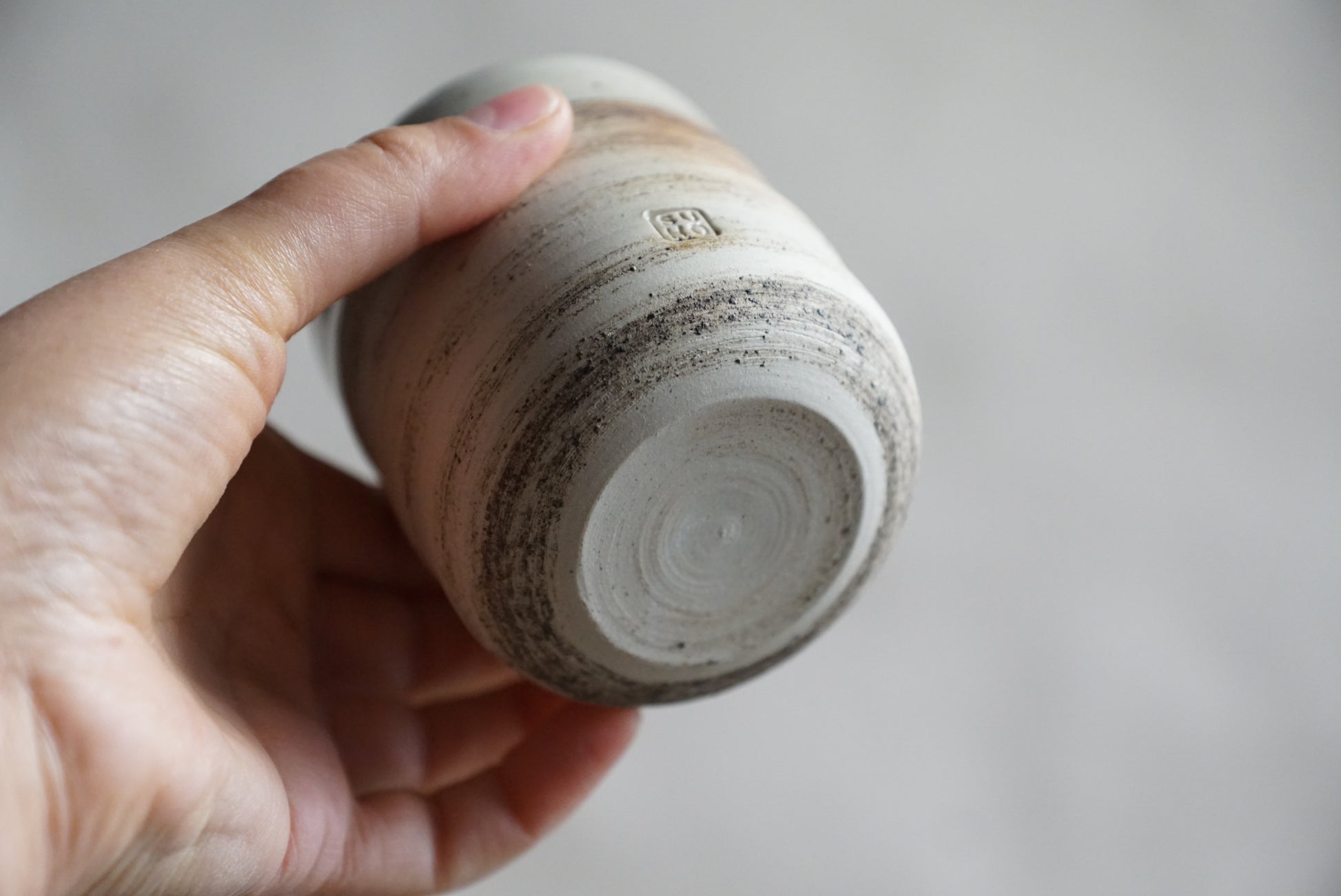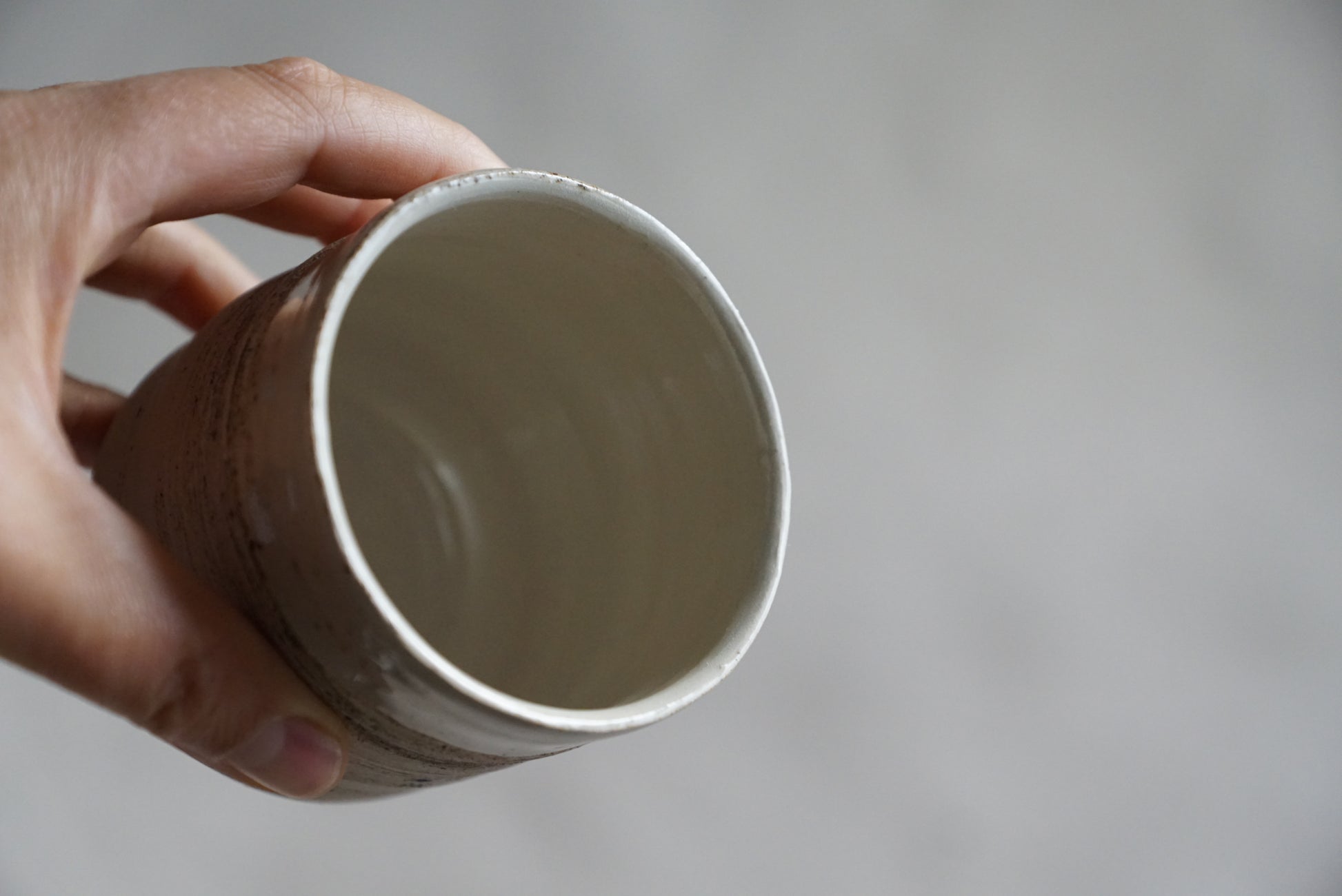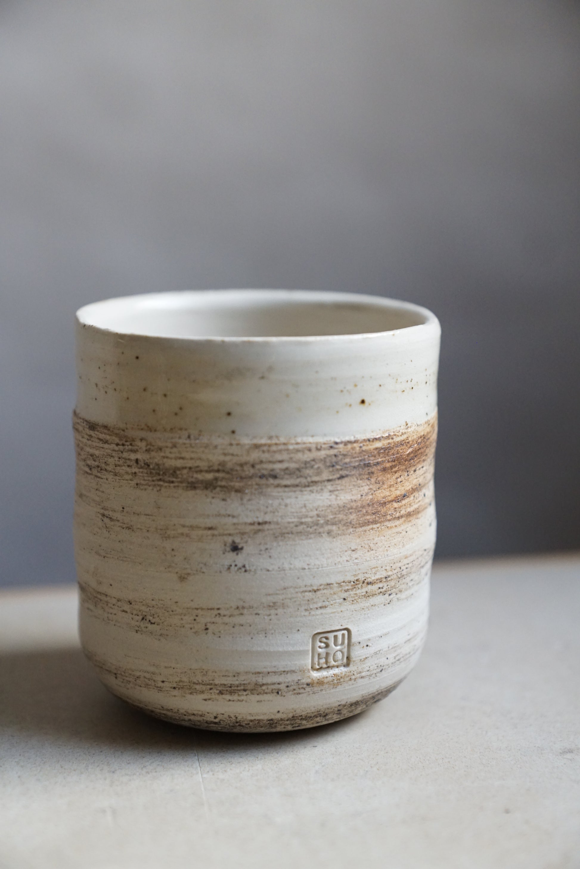 Einzelstück aus hellem Steinzeugton, schwarzem Schamott, von Hand gedreht, transparent glasiert, gebrannt bei 1230°C.