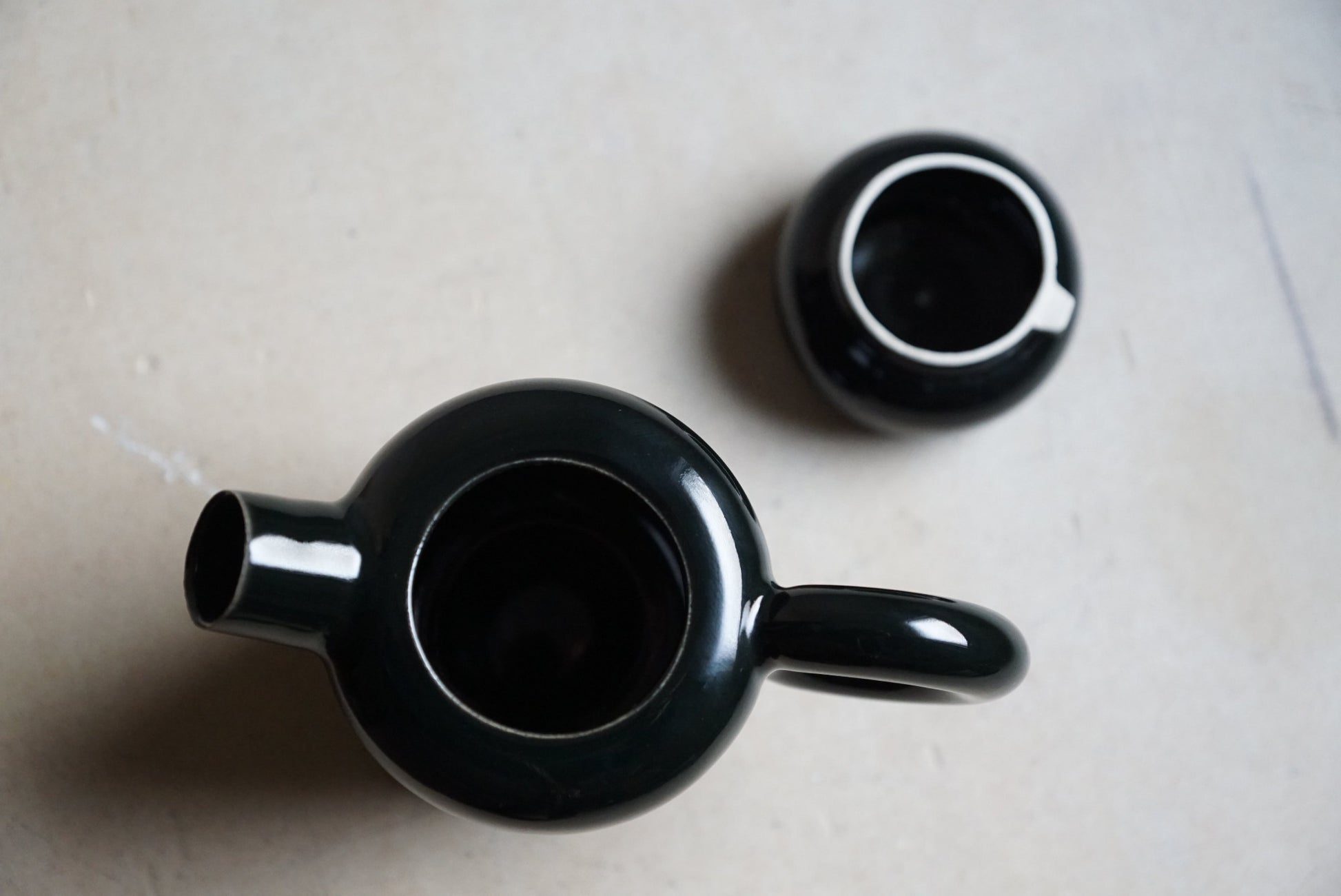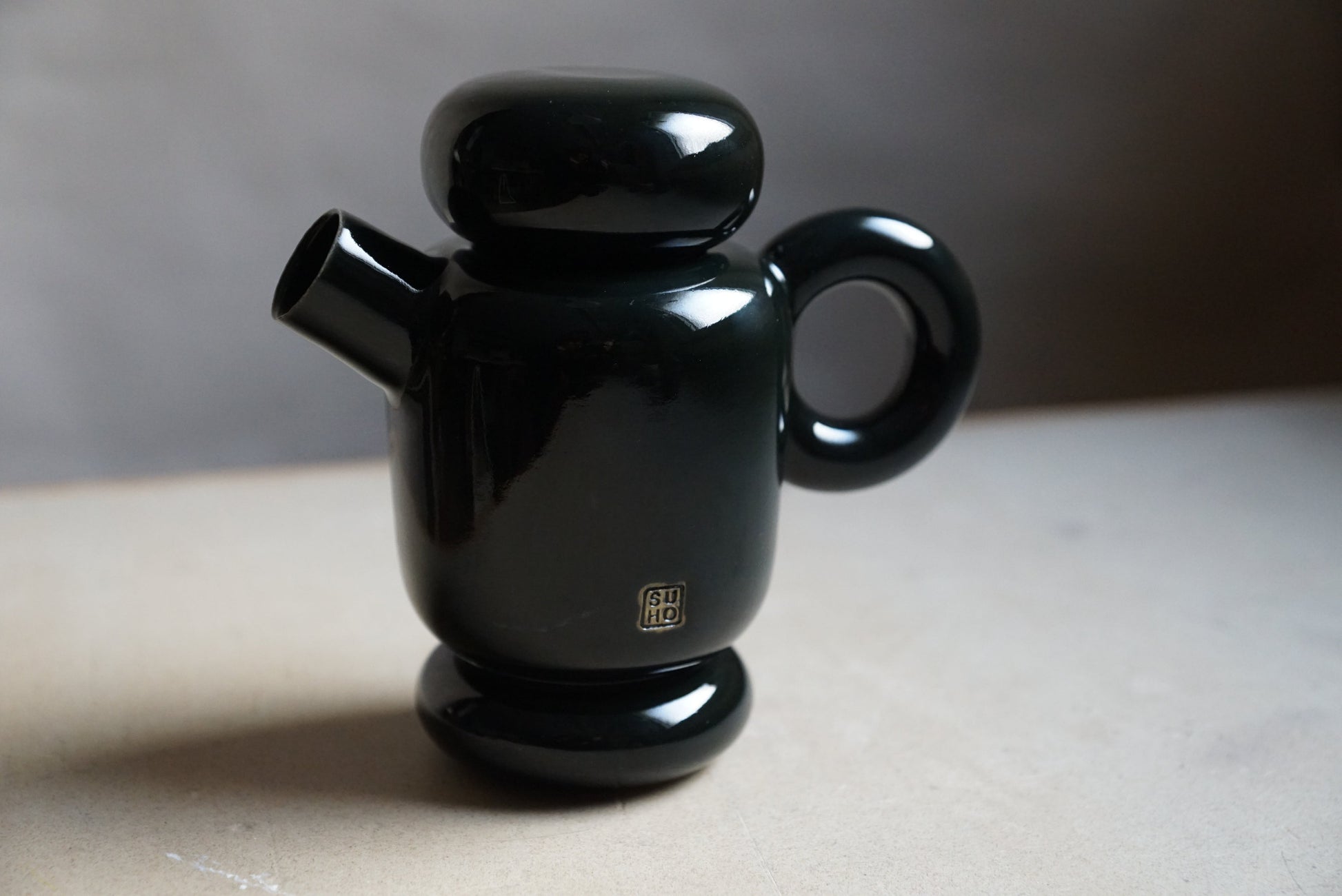 Unikat aus hellem Steinzeugton, glänzend schwarz glasiert, zusammengefügt aus insgesamt fünf von Hand gedrehten Teilen.