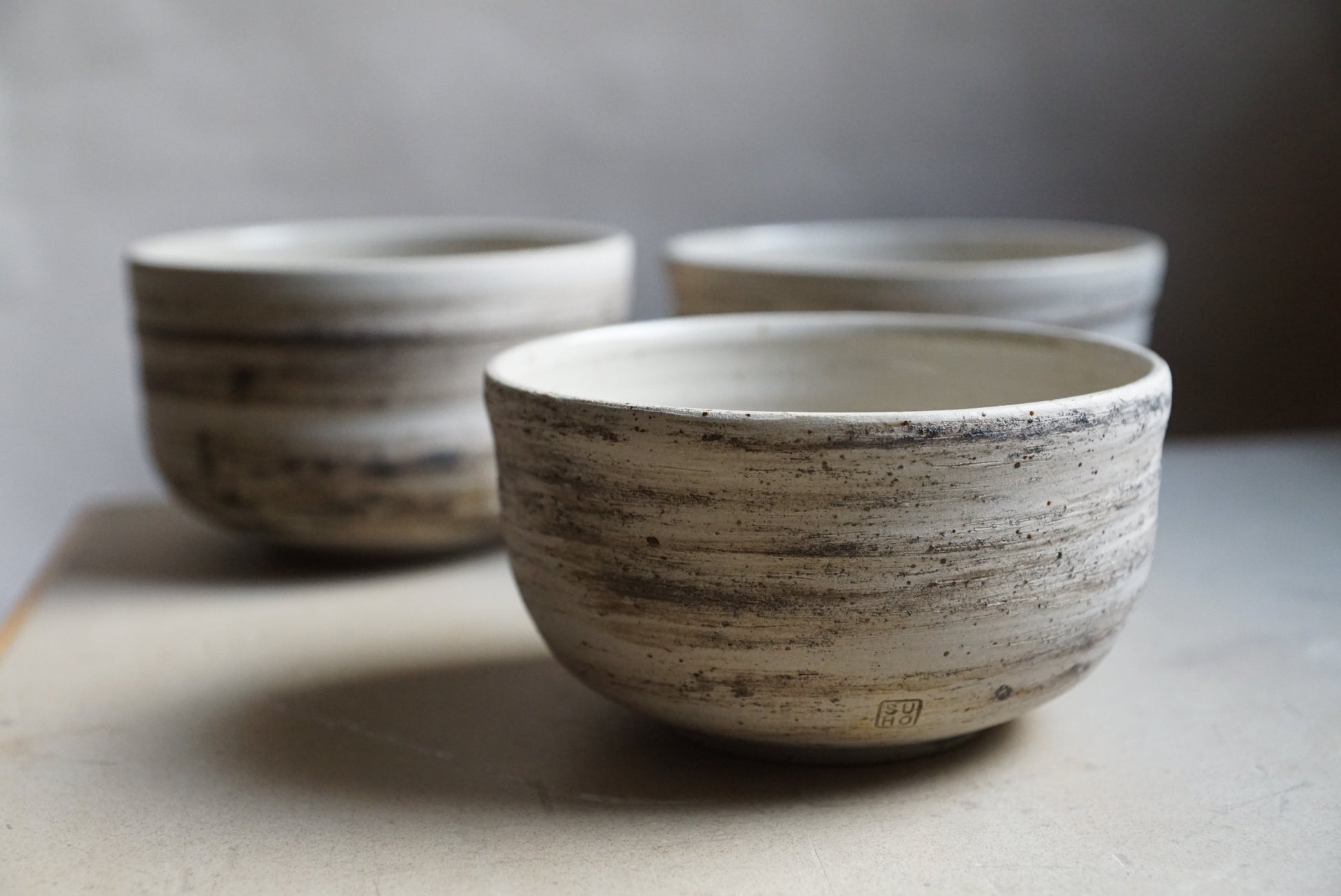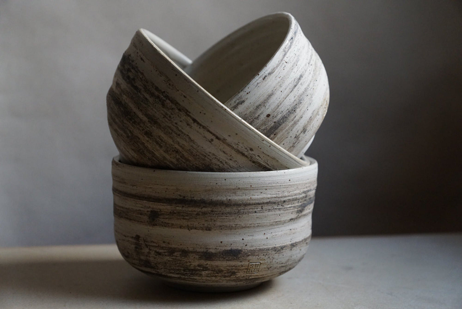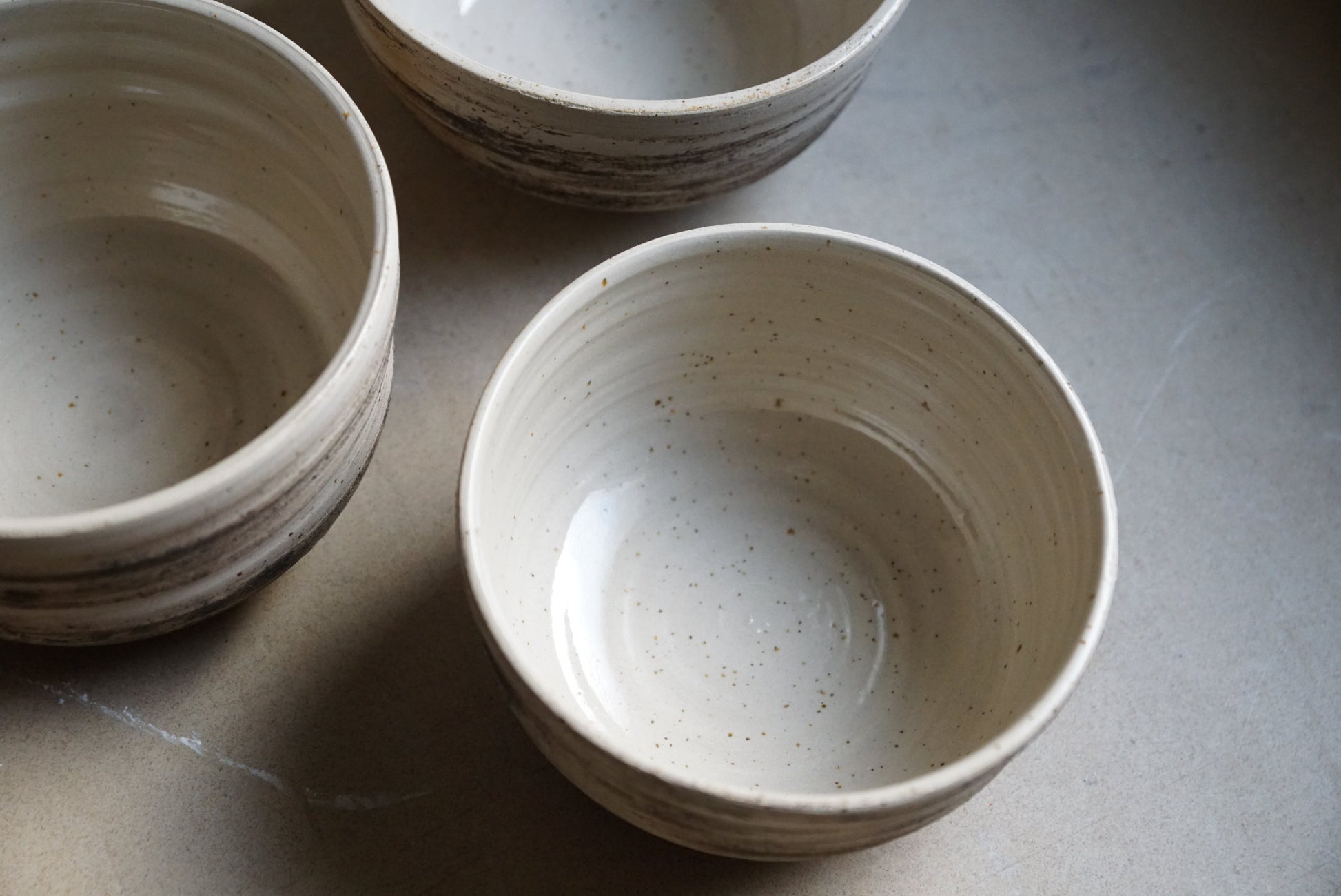 Unikatschalen aus hellem Steinzeugton mit schwarzem Schamott, von Hand gedreht, innen transparent glasiert, gebrannt bei 1230°C.