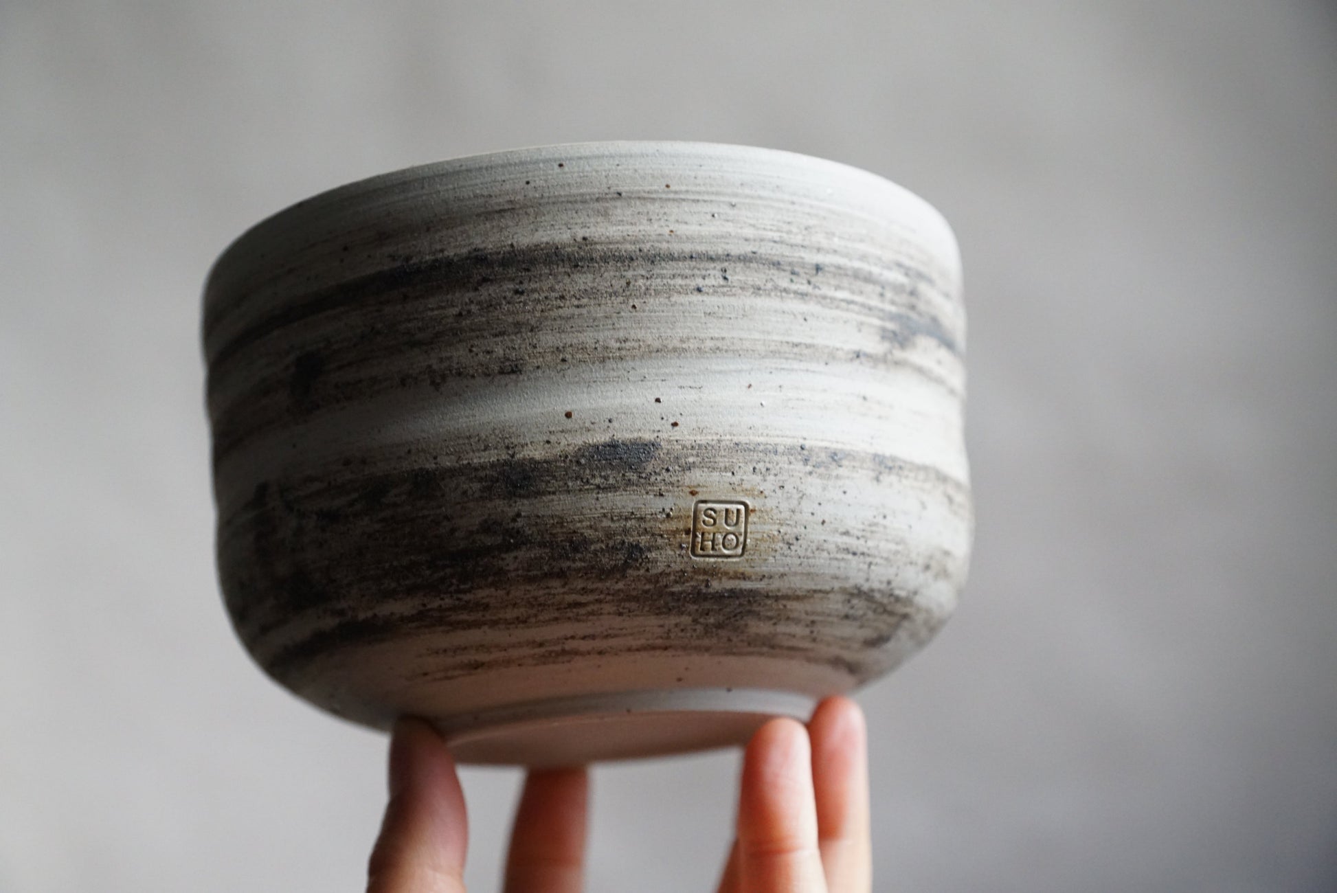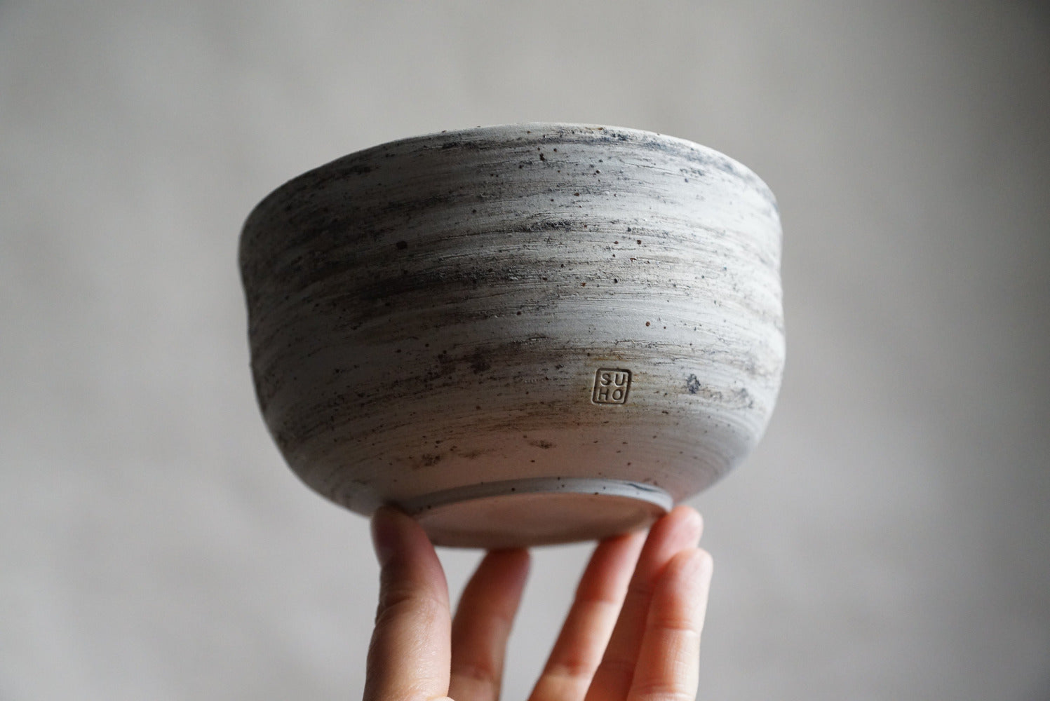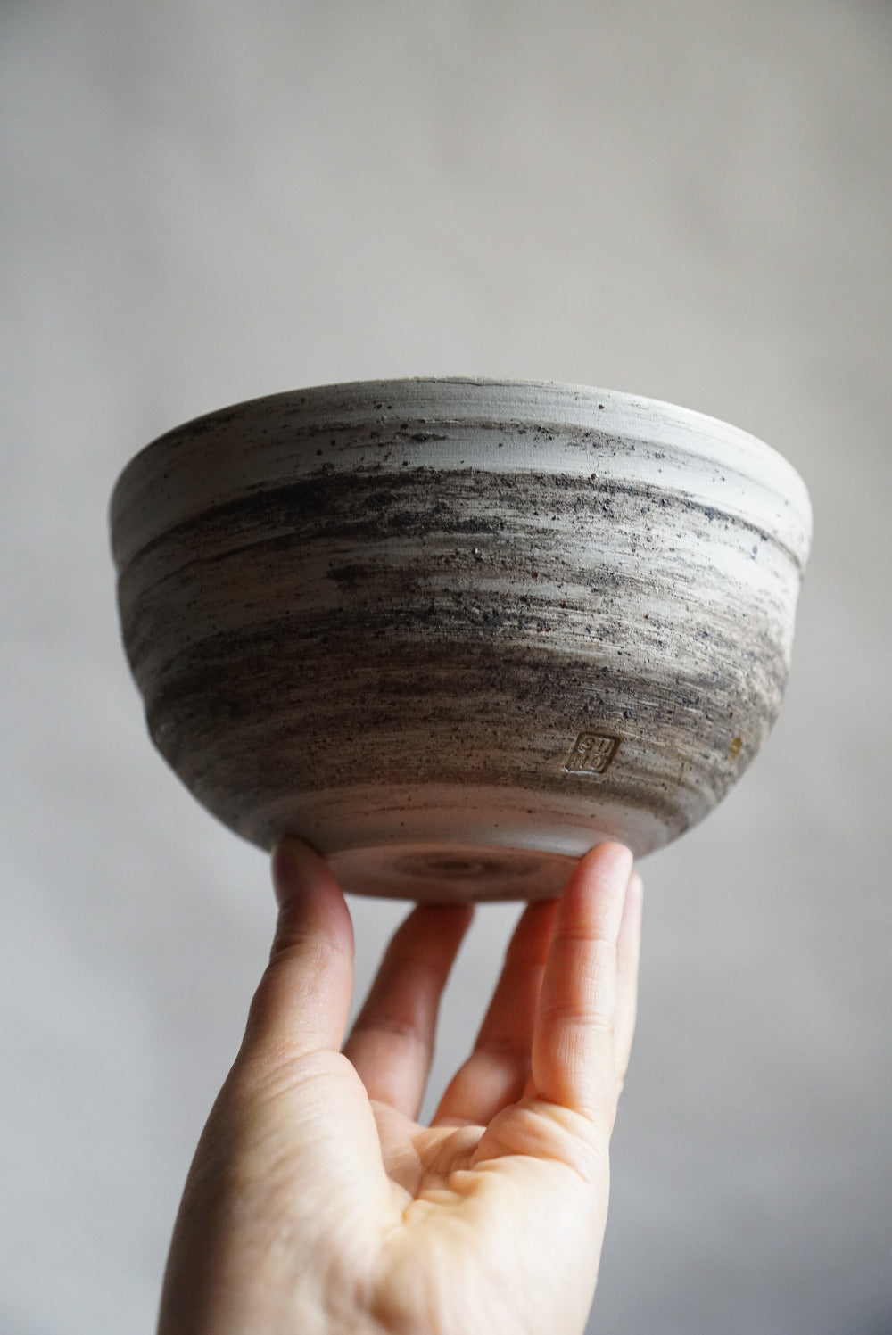 Unikatschalen aus hellem Steinzeugton mit schwarzem Schamott, von Hand gedreht, innen transparent glasiert, gebrannt bei 1230°C.